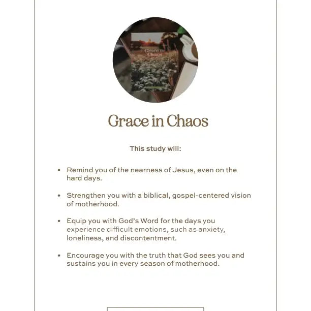 Grace in Chaos | 5 Week Study | Biblical Hope for the Hard Days of Motherhood He tends his flock like a shepherd: He gathers the lambs in his arms and carries them close to his heart; he gently leads those that have young. Isaiah 40:11 (NIV) Do you ever feel overwhelmed as a mom—struggling with anxiety, despair, or comparison? For many women, motherhood feels like simultaneously the greatest responsibility in the world and the most difficult one. Thankfully, we do not walk alone. God is with us in our motherhood—gently strengthening, helping, and restoring us. He is tender and compassionate with us on our hard days of mothering, our very present help in every season. Discover The Daily Grace Co.’s Christian resources! From Bible study tools and beautiful Bible tabs, to inspiring gifts for Easter and Valentine’s Day, our products are designed to help you grow deeper in God’s Word.