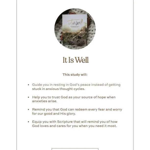 It Is Well | 3 Week Study | Walking Away From Anxiety and Into God’s Word "Come to me, all of you who are weary and burdened, and I will give you rest." Matthew 11:28 Is there hope in Christ for us when anxiety swells within? Can we find peace in God when our circumstances are anything but peaceful? The answer to these questions is yes! It Is Well | Anxiety Study is a three-week study that will: * Encourage you to rest in God’s peace instead of staying stuck in anxious thought cycles * Help you to trust God as your source of hope when anxieties arise * Remind you that God can redeem every fear and worry for our good and His glory * Equip you with Scripture that will remind of God’s love and care for you when you need it most Discover The Daily Grace Co.’s Christian resources! From Bible study tools and beautiful Bible tabs, to inspiring gifts for Easter and Valentine’s Day, our products are designed to help you grow deeper in God’s Word.
